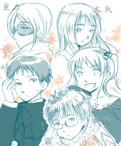 イラスト超歴大陸 超大陸-第3時代(6+α) 主人公のカヤ 霧の人、タイラの先生 師匠たち ↑拍手に使っていた絵 ↓主人公側のキャラたち(アイコンはPictBear使用の絵より) カヤ(草):飛行能力あり テル(明):友達 アキ(視):いわくありの彼氏 タイラ(水):名家のぼっちゃん ヒジリ(土):資料室が生息域 エン(炎):医者の卵、寮生(1人だけ顔がなかった;) フウ(風):自分の能力で飛べる おまけ ペンギンの子 恐竜とテル 超大陸-第三の時代/現代編 やっぱり中学・高校の時から考えてた話 ※名前にある漢字は能力 設定が絵の素材にしやすいので昔からよく描いてる子達でした まとめ110301,140112
