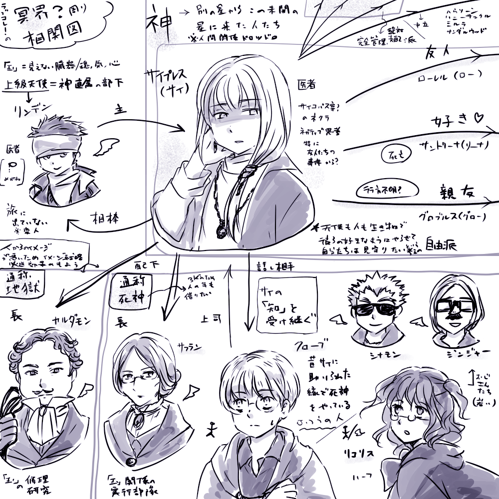 イラストマンガラブコレ超歴大陸 ラブコレ絵まとめ-冥界 リンデンとラベンダー 「トビアと天使」モチーフ絵のパロ 後である本を読んでいたら、ラファエルさんの特徴と似ててびっくりした 医者、冥界、旅、快活な性格… オリジナルの世界なので関係ないんだけど あ、本を引っ張りだして確認したら「カルサグ叙事詩」だった シュメール、紀元前3千年前の粘土板で、1万2千年前の記録 記憶違いで、アトランティスやムーの方が先だった 参考「天使の世界」 200617 うろ覚えリンデンとサイプレスらくがき 眼鏡は医療道具…のようなもの 200616 クローブ 死神連 らくがき漫画? リストは狩る人一覧 眼鏡は仕事道具 200623 ↓冥界周り相関図 見る こう見るとサイ様一方通行でかわいそうw 220503 畳む